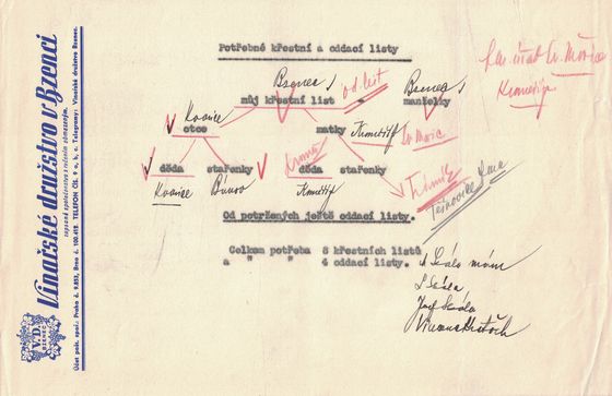 Celkem tedy od každého 8 křestních a rodných listů. – Některé z těchto nemohli jsme opatřiti a zaslali jsme je proto pouze potud, pokud bylo možno.