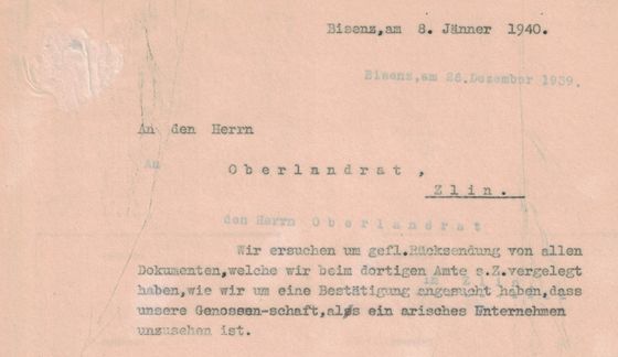 Wir ersuchen um gefl. Rücksendung von allen Dokumenten, welche wir beim dortigen Amte s.Z. vergelegt haben, wie wir um eine Bestätigung angesucht haben, dass unsere Genossen-schaft als ein arisches Unternehmen unzusehen ist.