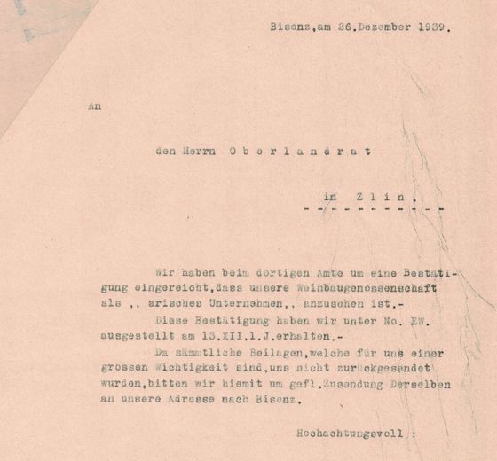 Wir haben beim dortigen Amte um eine Bestätigung eingereicht, dass unsere Weinbaugenossenschaft als „arisches Unternehmen“ anzusehen ist.