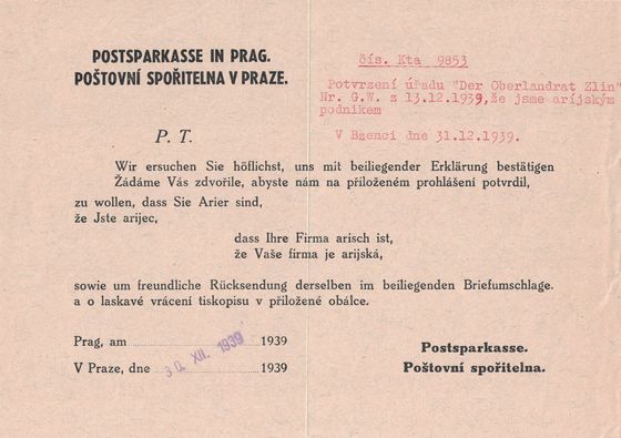 Dne 30. 12. 1939 – žádost o zaslání prohlášení o árijském podniku – Poštovní spořitelna v Praze: