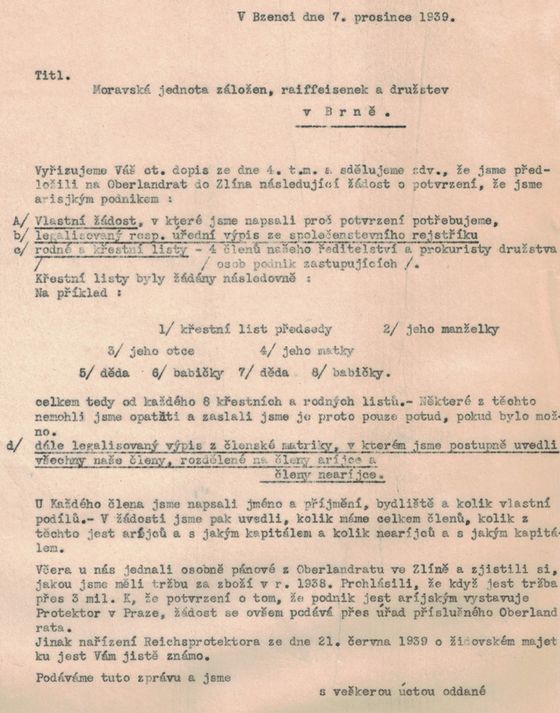Včera u nás jednali osobně pánové z Oberlandratu ve Zlíně a zjistili si, jakou jsme měli tržbu za zboží v r. 1938. Prohlásili, že když jest tržba přes 3 mil. K, že potvrzení o tom, že podnik jest árijským vystavuje Protektor v Praze, žádost se ovšem podává přes úřad příslušného Oberlandrata.