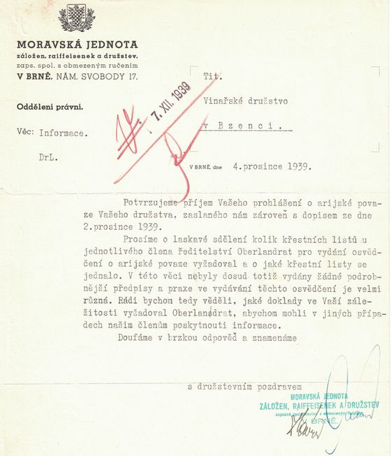 Potvrzujeme příjem Vašeho prohlášení o arijské povaze Vašeho družstva, zaslaného nám zároveň s dopisem ze dne 2. prosince 1939.