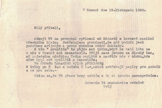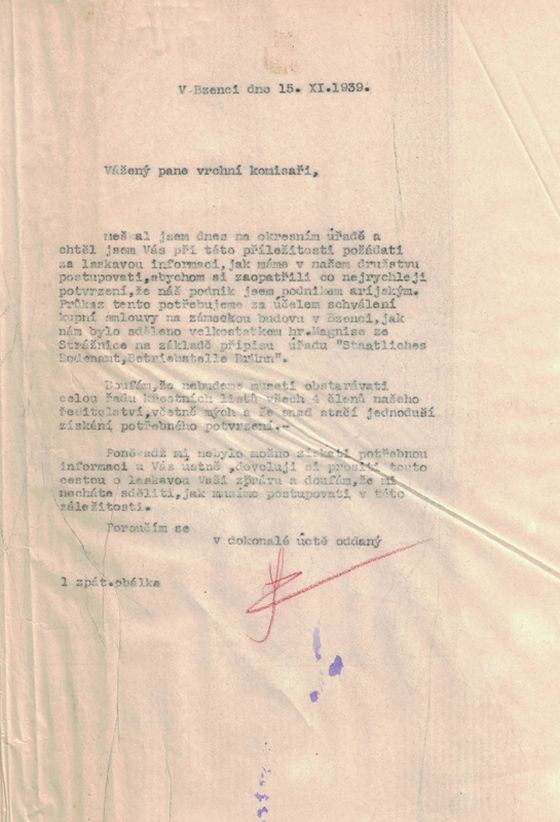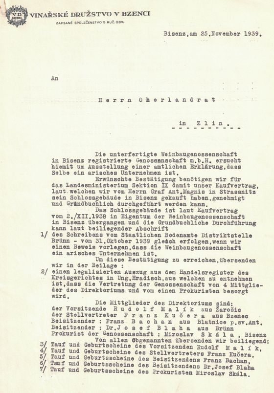 Potřebujeme velmi nutně potvrzení o tom, že naše družstvo jest podnikem árijským, neboť tento doklad musíme předložiti, aby nám mohl Protektor posléze schváliti kupní smlouvu na zámeckou budovu v Bzenci.