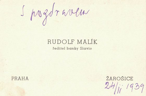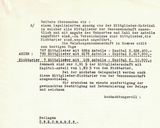 Oznamujeme k tomu zdv., že všichni 4 pánové našeho ředitelstva, jakož i prok. Skála mohou prokázati svůj arijský původ, také naše družstvo nemá více, než snad asi 5–6 členů neárijců z celkového počtu přes 750 členů, a tito nevlastní více než snad asi 18.000.– Kč na podílech z kap. na podílech přes Kč 610.000.– Sami nezaměstnáváme žádného neárijce, takže jsme čistě arijským podnikem. –