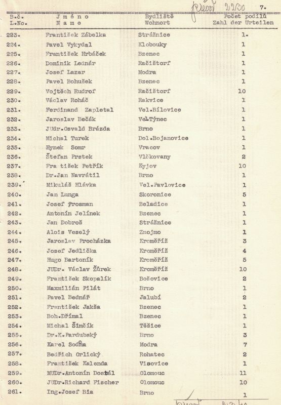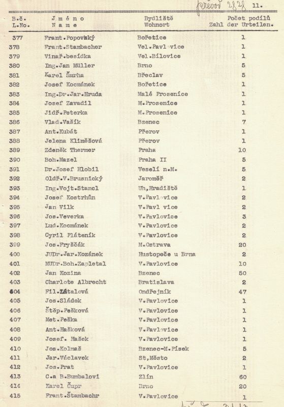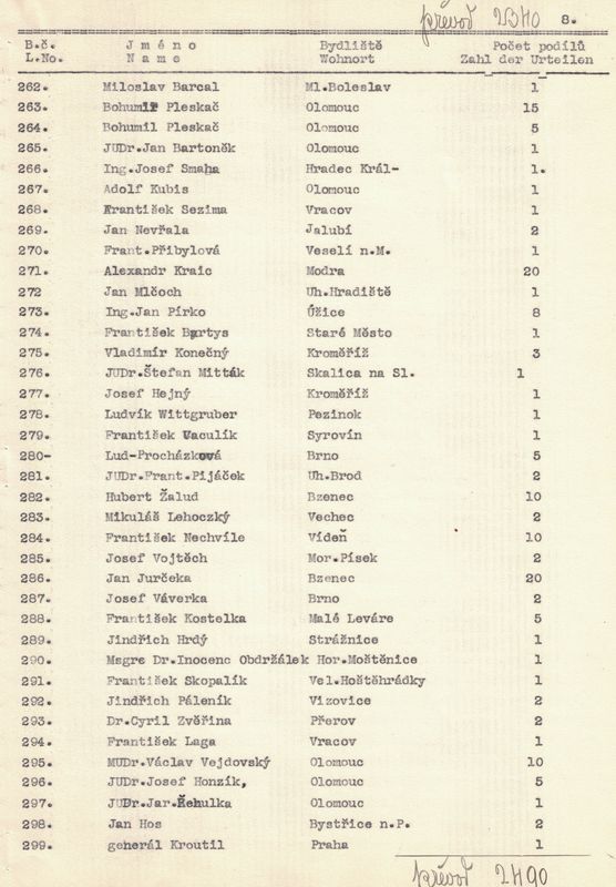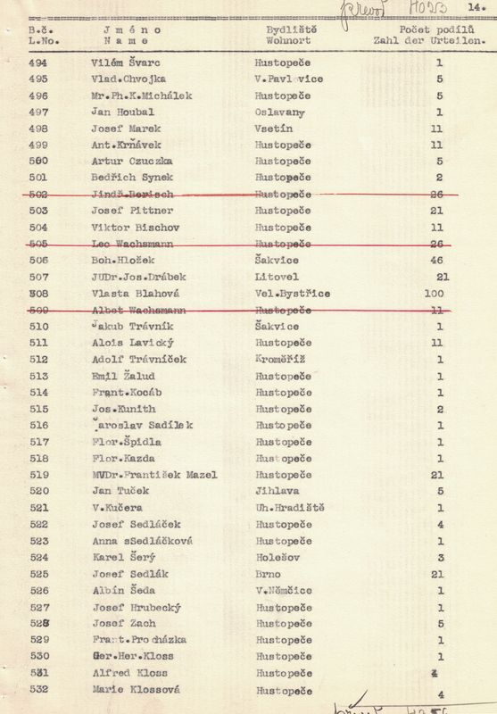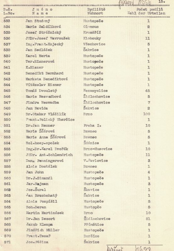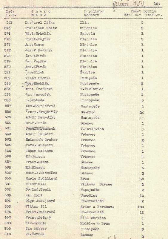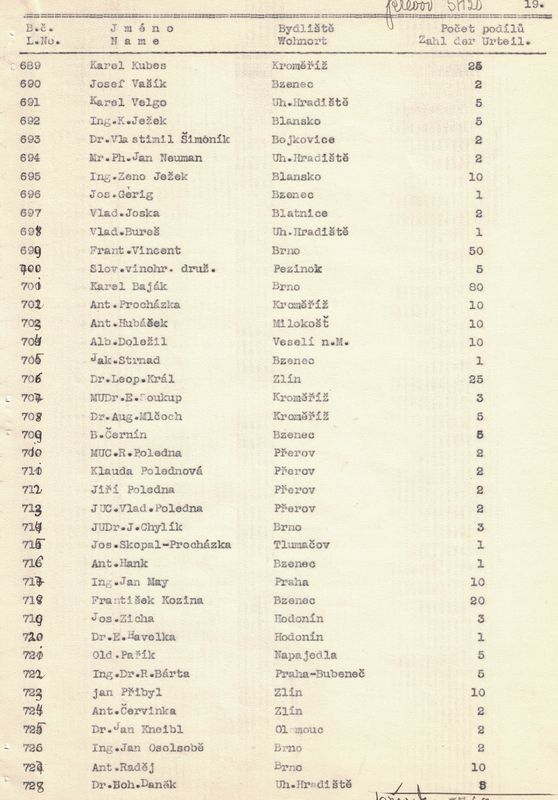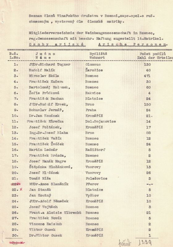 U každého člena jsme napsali jméno a příjmení, bydliště a kolik vlastní podílů. – V žádosti jsme pak uvedli, kolik máme celkem členů, kolik z těchto jest árijců a s jakým kapitálem a kolik neárijců a s jakým kapitálem.