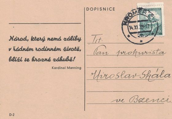 Schůze sobotní je svolána na 10 hod. dopoledne. Jak se dovídám, nejezdí snad již vlak, který byl v Bzenci o 10 hod., a budete muset proto použít vlaku, který odjíždí z Brna o 5.50 hod., neb lépe bude, kdybyste přijel do Bzence v pátek odpoledne.