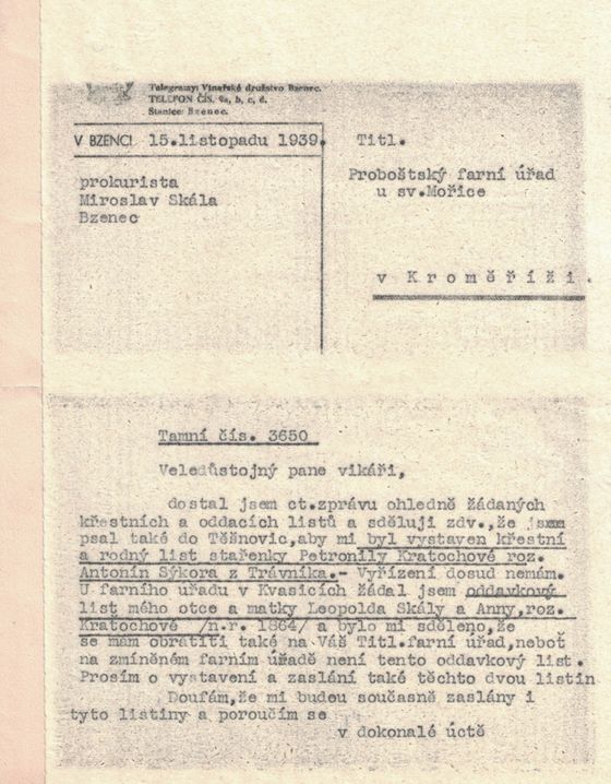 Sotva jsme se rozešli, setkal jsem se s p. Kudláčkem, který mi sdělil, že pro schválení kupu čeká prý něm. komisař poz. úřadu v Brně na předložení osvědčení o árijském původu družstva. A sice musí ho předložiti všichni, kdož jsou uvedeni v rejstříku, tedy asi členové ředitelství a pak prokuristé. Každý z nás tedy předloží křestní list a to: