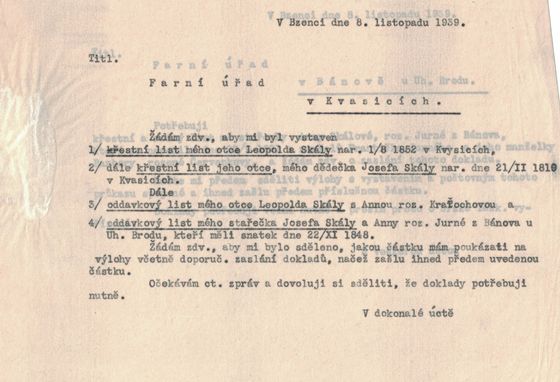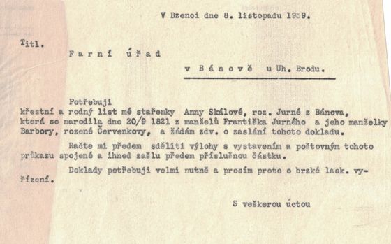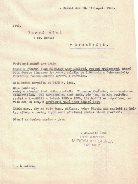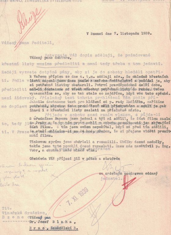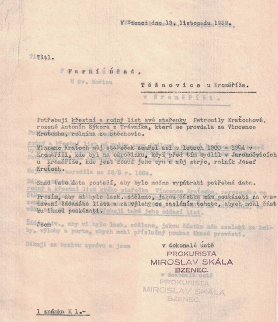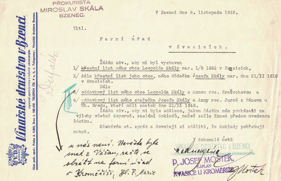 k Vašemu přípisu ze dne 4. t. m. sděluji zdvořile, že ohledně křestních listů napsal jsem dnes pánům členům našeho družstva a požádal je, aby si potřebné listiny obstarali. Potrvá pravděpodobně delší dobu, nežli dostaneme od všech všechny potřebné listy do rukou. Ovšem vynasnažíme se, aby se tak stalo co nejdříve, když věc tato spěchá.
