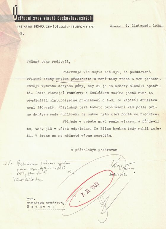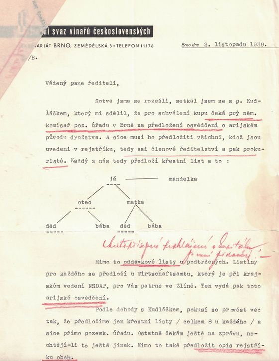 U tamního úřadu jsme podali žádost o potvrzení, že naše vinařské družstvo má být považováno za „árijský podnik“.