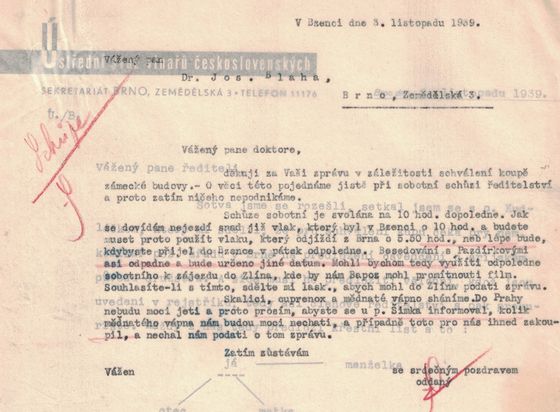 Organizační pokyny k projednání koupě zámecké budovy a zajištění potřebného materiálu (3. 11. 1939)