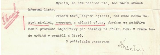 Skalici, cuprenox a měďnaté vápno sháníme. Do Prahy nebudu moci jeti, a proto prosím, abyste se u p. Šimka informoval, kolik měďnatého vápna nám budou moci nechati, a případně toto pro nás ihned zakoupil a nechal nám podati o tom zprávu.