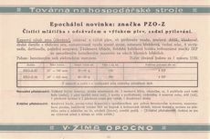 Konečně dovolujeme si k vůli Vaší informaci podotknouti, že jsme jednou z největších a nejstarších specielních továren výhradně na čistící mlátičky a mlýnky, které pod známkou ORIGINAL PATENT ZIMA mají pověst téměř světovou, takže byste svým známým doporučením našich kvalitních výrobků jen velmi dobře posloužil. Záruku na naše stroje poskytujeme několikaletou a platební podmínky nejpohodlnější, dle potřeby kupujícího.