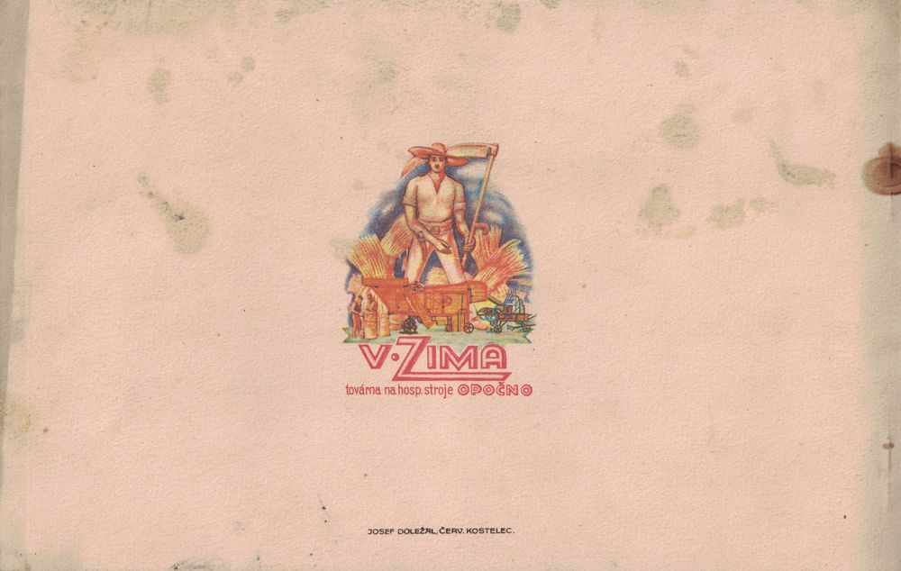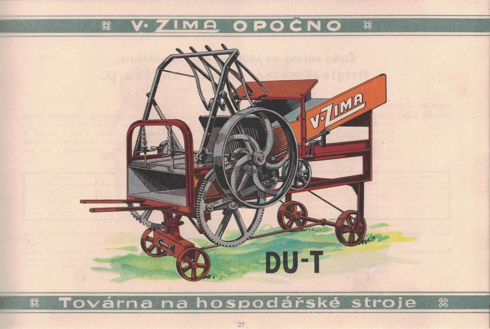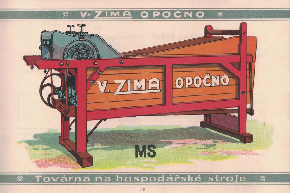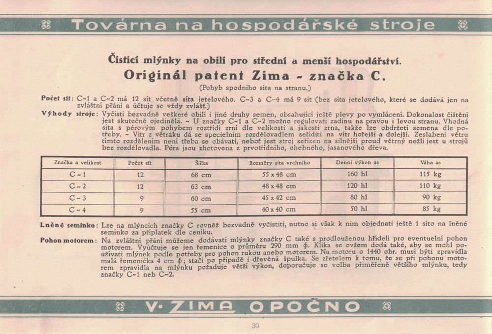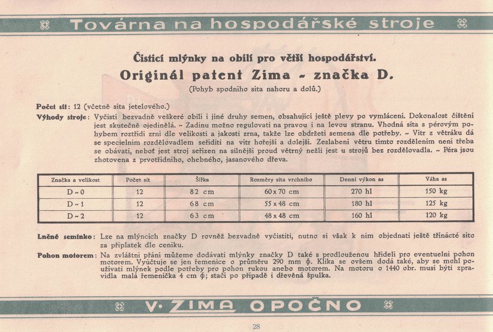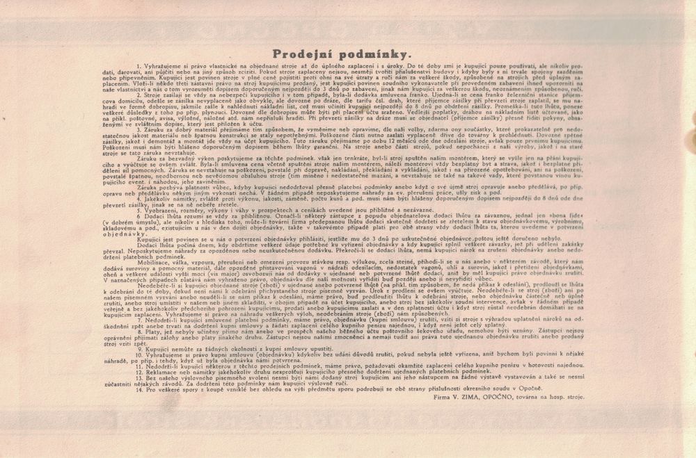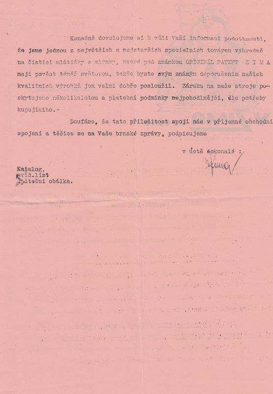 Konečně dovolujeme si k vůli Vaší informaci podotknouti, že jsme jednou z největších a nejstarších specielních továren výhradně na čistící mlátičky a mlýnky, které pod známkou ORIGINAL PATENT ZIMA mají pověst téměř světovou, takže byste svým známým doporučením našich kvalitních výrobků jen velmi dobře posloužil. Záruku na naše stroje poskytujeme několikaletou a platební podmínky nejpohodlnější, dle potřeby kupujícího.