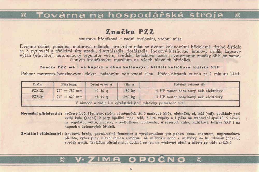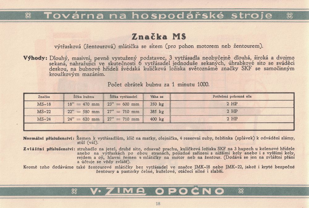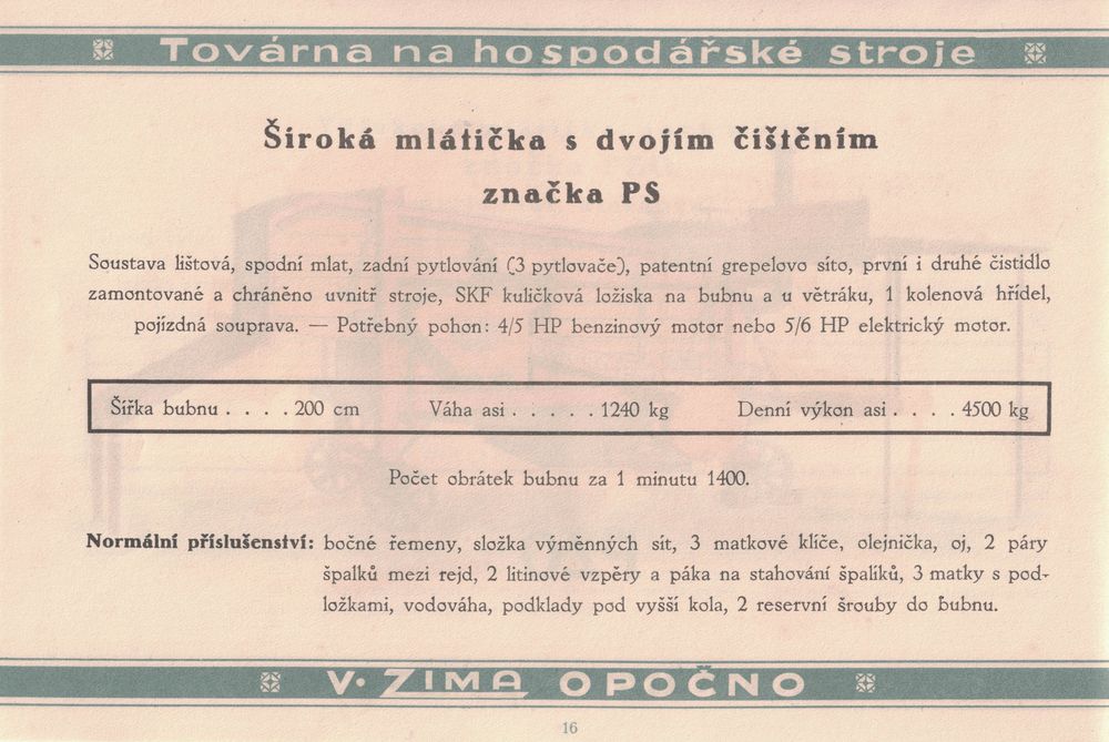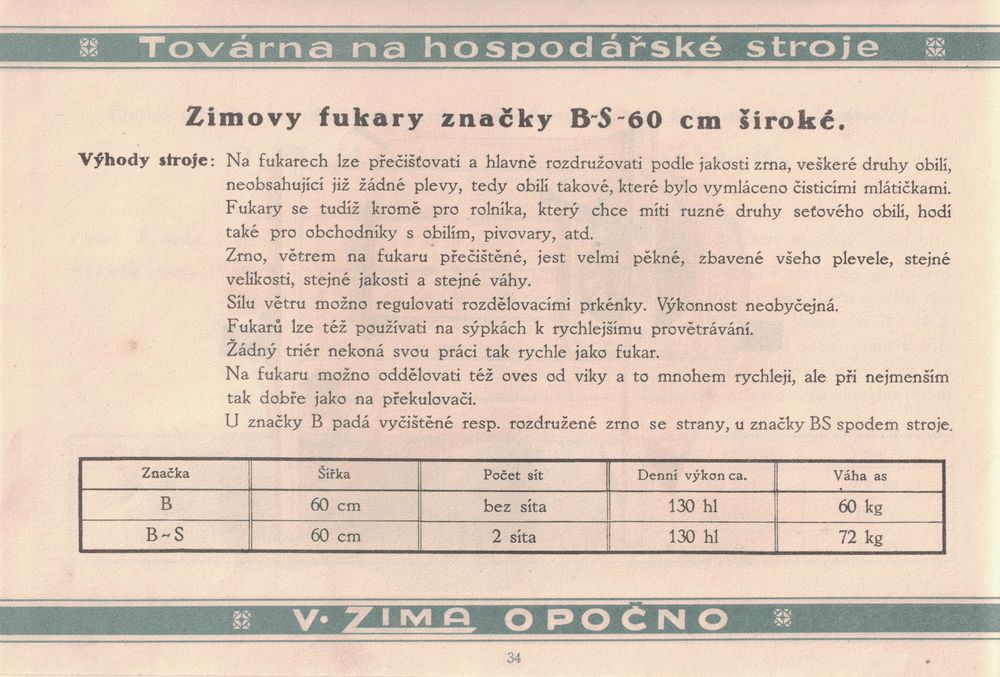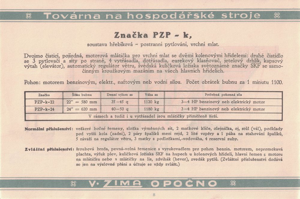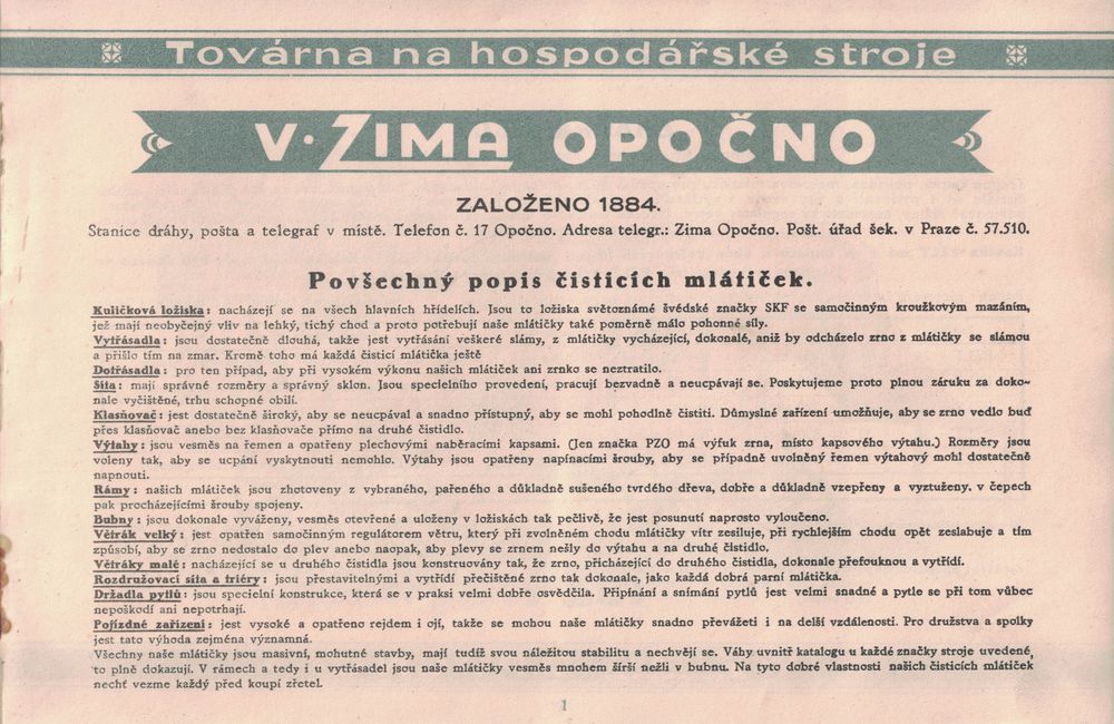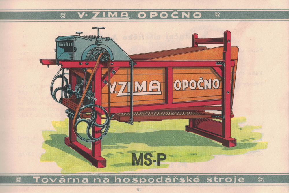 Konečně dovolujeme si k vůli Vaší informaci podotknouti, že jsme jednou z největších a nejstarších specielních továren výhradně na čistící mlátičky a mlýnky, které pod známkou ORIGINAL PATENT ZIMA mají pověst téměř světovou, takže byste svým známým doporučením našich kvalitních výrobků jen velmi dobře posloužil. Záruku na naše stroje poskytujeme několikaletou a platební podmínky nejpohodlnější, dle potřeby kupujícího.
