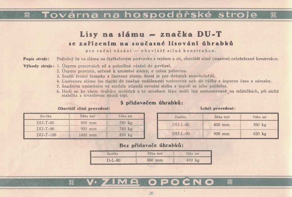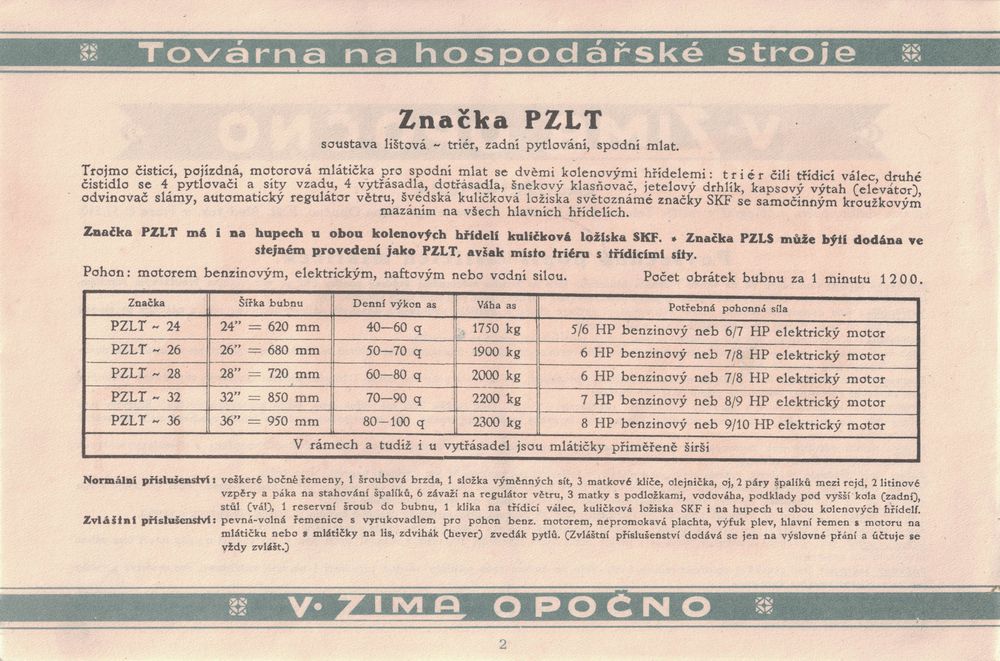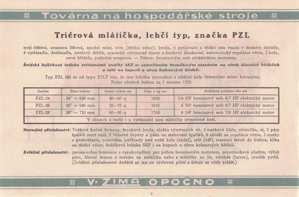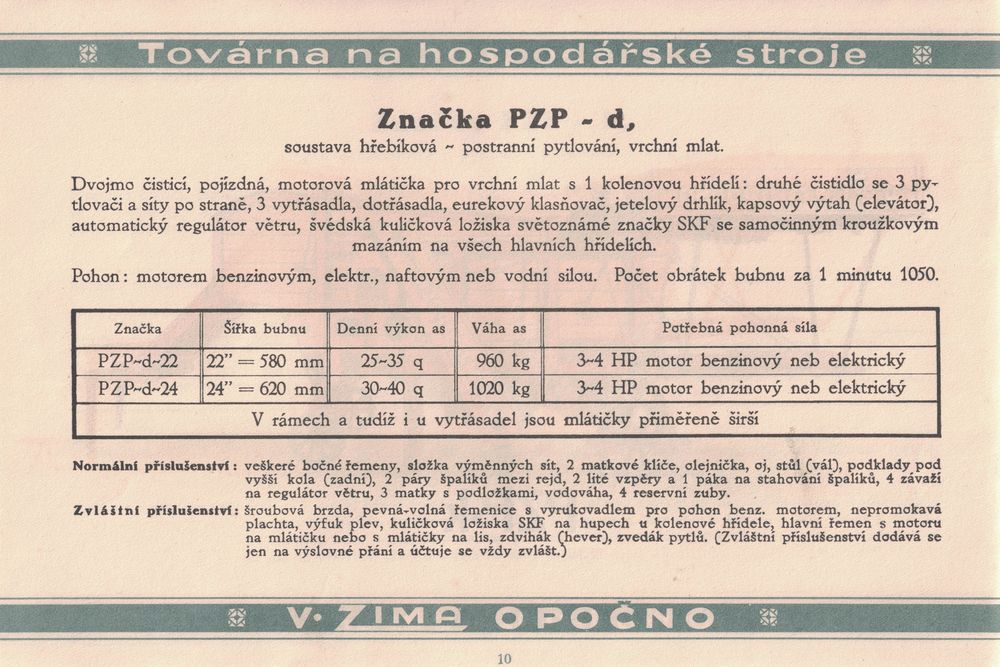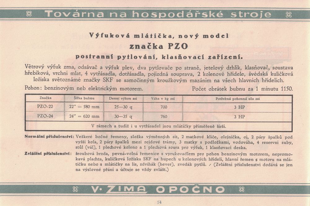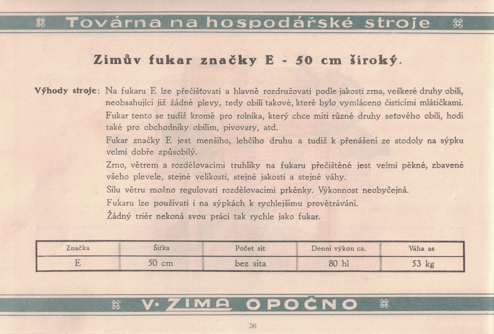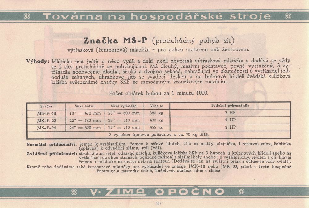 Konečně dovolujeme si k vůli Vaší informaci podotknouti, že jsme jednou z největších a nejstarších specielních továren výhradně na čistící mlátičky a mlýnky, které pod známkou ORIGINAL PATENT ZIMA mají pověst téměř světovou, takže byste svým známým doporučením našich kvalitních výrobků jen velmi dobře posloužil. Záruku na naše stroje poskytujeme několikaletou a platební podmínky nejpohodlnější, dle potřeby kupujícího.
