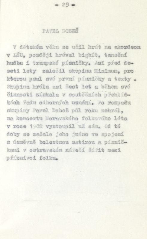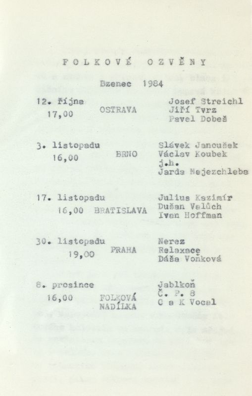 Publikujeme pro vás přepis a sken knihy Folkové ozvěny 1984, která zachycuje atmosféru prvního ročníku stejnojmenného cyklu koncertů konaných ve Bzenci. Kniha přibližuje vznik Ozvěn jako odezvy na Folkový kolotoč, popisuje tehdejší hudební dění a přináší medailonky interpretů i texty písní, které tehdy zazněly. Dílo tak nabízí nejen cenné svědectví o době, ale i živý obraz setkávání muzikantů a publika, jehož atmosféra se dodnes vrací ve vzpomínkách. Knihu uveřejňujeme s laskavým svolením pana Grombíře, kterému tímto velmi děkujeme.