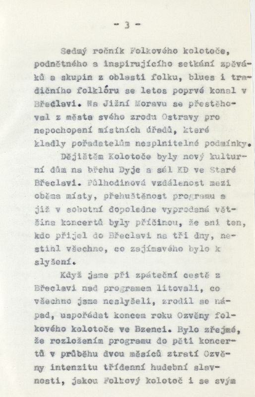 Sedmý ročník Folkového kolotoče, podnětného a inspirujícího setkání zpěváků a skupin z oblasti folku, blues i tradičního folklóru se letos poprvé konal v Břeclavi. Na Jižní Moravu se přestěhoval z města svého zrodu Ostravy pro nepochopení místních úřadů, které kladly pořadatelům nesplnitelné podmínky.