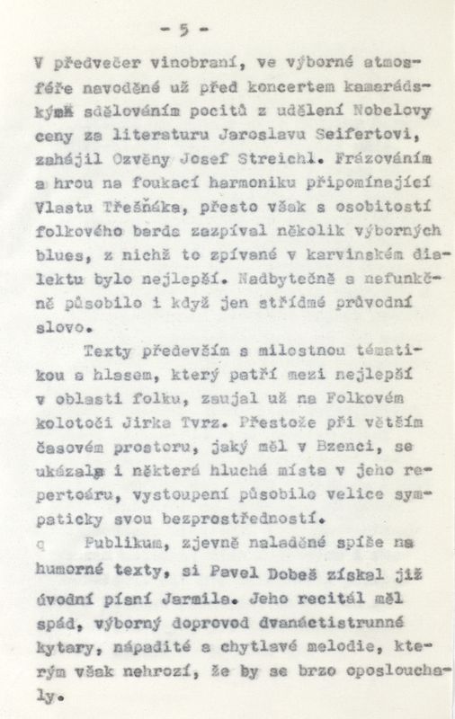 V předvečer vinobraní, ve výborné atmosféře navozené už před koncertem kamarádským sdělováním pocitů z udělení Nobelovy ceny za literaturu Jaroslavu Seifertovi, zahájil ozvěny Josef Streichl. Frázováním a hrou na foukací harmoniku připomínající Vlastu Třešňáka, přesto však s osobitostí folkového barda zazpíval několik výborných blues, z nichž to zpívané v karvinském dialektu bylo nejlepší. Nadbytečně s nefunkčně působilo i když jen střídmé průvodní slovo.