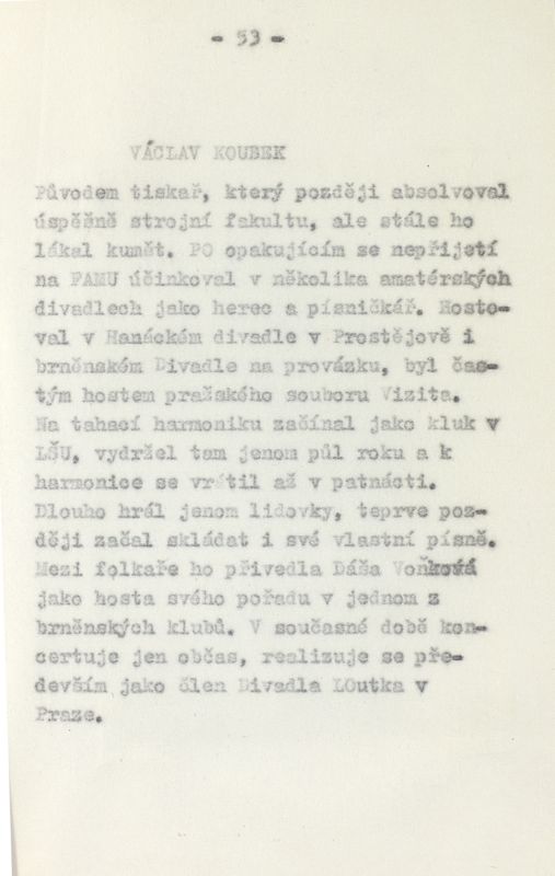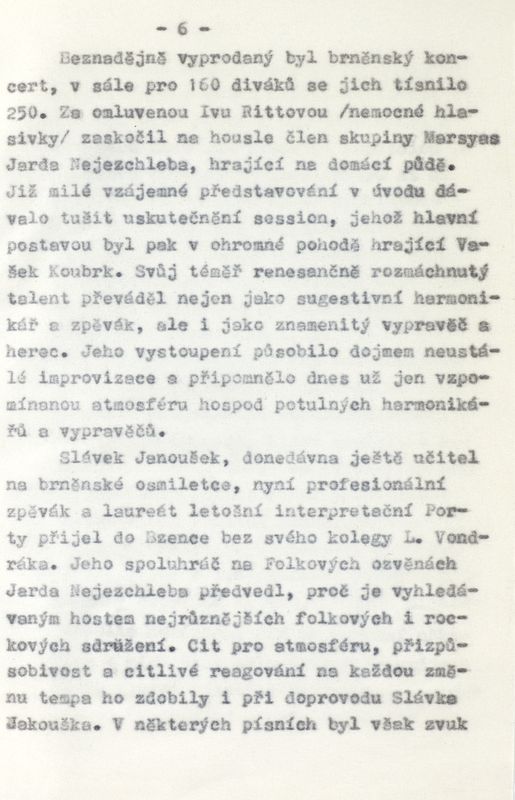 Beznadějně vyprodaný byl brněnský koncert, v sále pro 160 diváků se jich tísnilo 250. Za omluvenou Ivu Rittovou /nemocné hlasivky/ zaskočil ne housle člen skupiny Marsyas Jarda Nejezchleba, hrající na domácí půdě. Již milé vzájemné představování v úvodu dávalo tušit uskutečnění session, jehož hlavní postavou byl pak v ohromné pohodě hrající Vašek Koubrk. Svůj téměř renesančně rozmáchnutý talent převáděl nejen jako sugestivní harmonikář a zpěvák, ale i jako znamenitý vypravěč a herec. Jeho vystoupení působilo dojmem neustálé improvizace a připomnělo dnes už jen vzpomínanou atmosféru hospod potulných harmonikářů a vypravěčů.