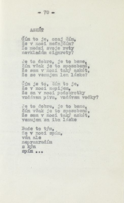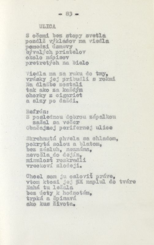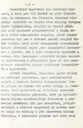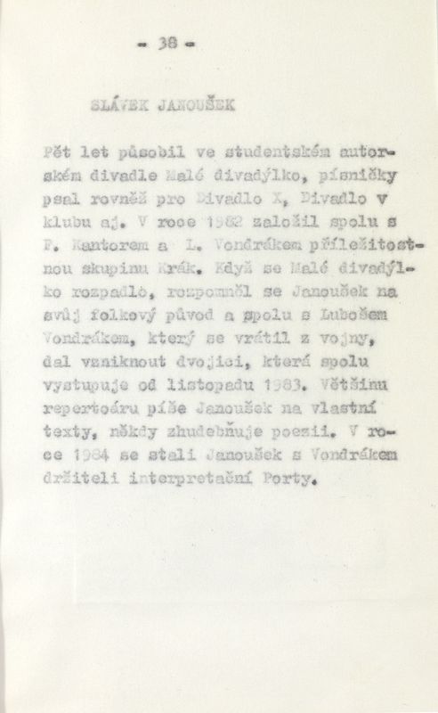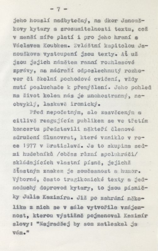 Slávek Janoušek, donedávna ještě učitel na brněnské osmiletce, nyní profesionální zpěvák a laureát letošní interpretační Porty přijel do Bzence bez svého kolegy L. Vondráka. Jeho spoluhráč ne Folkových ozvěnách Jarda Nejezchleba předvedl, proč je vyhledávaným hostem nejrůznějších folkových i rockových sdružení. Cit pro atmosféru, přizpůsobivost a citlivé reagování na každou změnu tempa ho zdobily i při doprovodu Slávka Janouška. V některých písních byl však zvuk jeho houslí nadbytečný, na úkor Janouškovy kytary a srozumitelnosti textu, což v menší míře platí i pro jeho hraní s Václavem Koubkem. Zvláštní kapitolou Janouškova vystoupení jsou texty. Ať už jsou jejich námětem ranní rozhlasové zprávy, na nádraží odposlechnutý rozhovor či školní pochodové cvičení, vždy nutí posluchače k přemýšlení. Jeho pohled na život kolem nás je mnohostranný, neobvyklý, laskavě ironický.