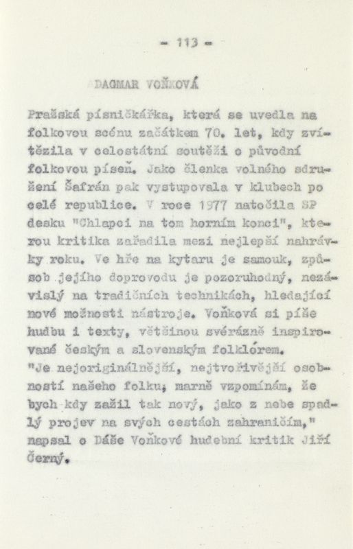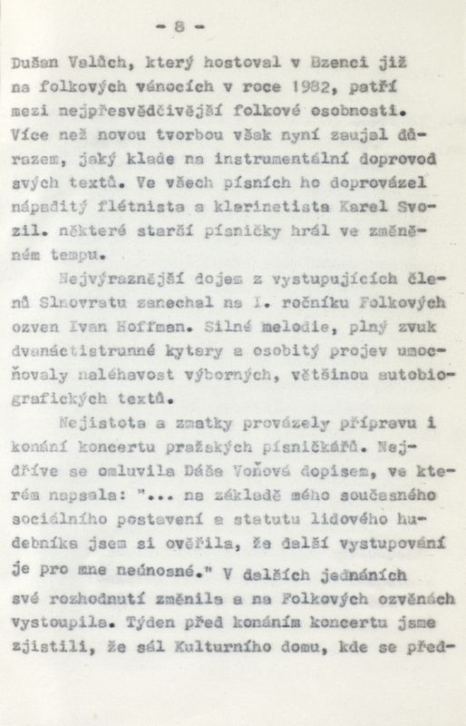 Mimořádným zážitkem bylo vystoupení Dáši Voňkové. Přes nepříjemné extempore s příslušníkem kontrolního orgánu v šatně, předvedla výkon, který zřejmě nemá na našich pódiích obdoby. Novátorské, virtuózní hraní na kytaru a stejně originální zpěv, pokora, s jakou přistupuje k folklóru, který zjevuje v dosud nepoznané kráse a svou vlastní tvorbou Dáša Voňková naplňuje podstatu hudby a kultury vůbec, vychovává ke kráse.