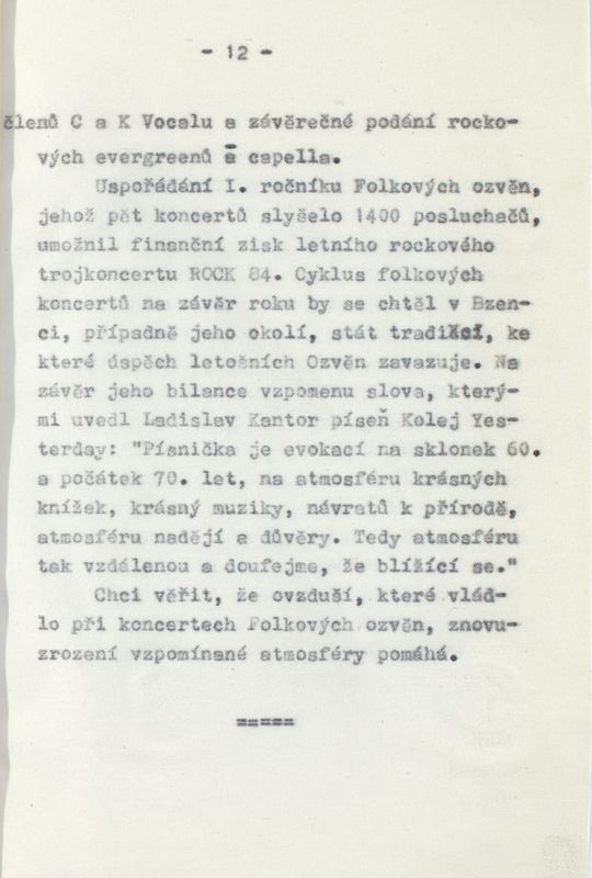 Uspořádání I. ročníku Folkových ozvěn, jehož pět koncertů slyšelo 1400 posluchačů, umožnil finanční zisk letního rockového trojkoncertu ROCK 84. Cyklus folkových koncertů na závěr roku by se chtěl v Bzenci, případně jeho okolí, stát tradicí, ke které úspěch letošních Ozvěn zavazuje. Na závěr jeho bilance vzpomenu slova, kterými uvedl Ladislav Kantor píseň Kolej Yesterday: „Písnička je evokací na sklonek 60. a počátek 70. let, na atmosféru krásných knížek, krásné muziky, návratů k přírodě, atmosféru nadějí a důvěry. Tedy atmosféru tak vzdálenou a doufejme, že i blížící se.“