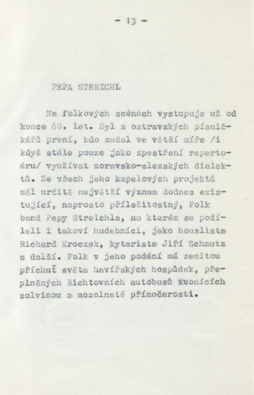 Na folkových scénách vystupuje už od konce 60. let. Byl z ostravských písničkářů první, kdo začal ve větší míře /i když stále pouze jako zpestření repertoáru/ využívat moravsko-slezských dialektů. Ze všech jeho kapelových projektů měl určitě největší význam dodnes existující, naprosto příležitostný, Folk band Pepy Streichla, na kterém se podíleli i takoví hudebníci, jako houslista Richard Kroczek, kytarista Jiří Schmutz a další. Folk v jeho podání má zemitou příchuť světa havířských hospůdek, přeplněných šichtovních autobusů vonících solvinou a mozolnaté přímočarosti.