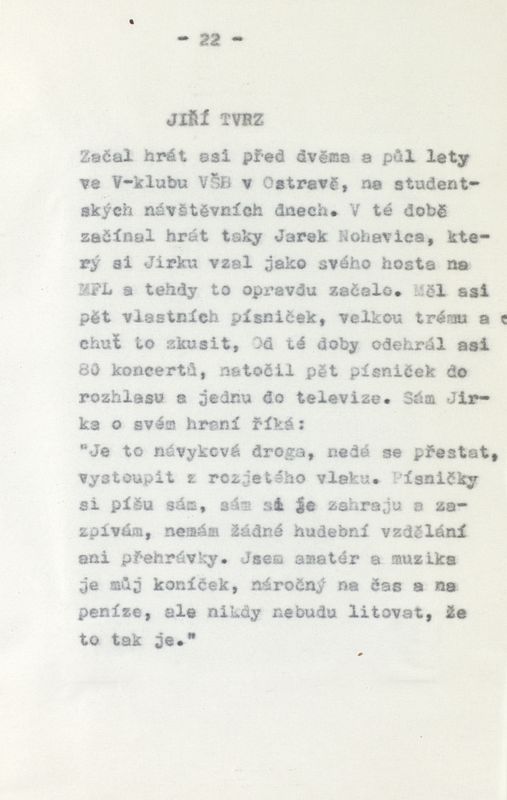 Texty především s milostnou tématikou a hlasem, který patří mezi nejlepší v oblasti folku, zaujal už na Folkovém kolotoči Jirka Tvrz. Přestože při větším časovém prostoru, jaký měl v Bzenci, se ukázala i některá hluchá místa v jeho repertoáru, vystoupení působilo velice sympaticky svou bezprostředností.