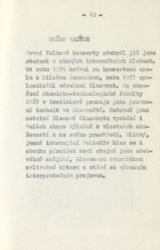 Dušan Valůch, který hostoval v Bzenci již na folkových vánocích v roce 1982, patří mezi nejpřesvědčivější folkové osobnosti. Více než novou tvorbou však nyní zaujal důrazem, jaký klade na instrumentální doprovod svých textů. Ve všech písních ho doprovázel nápaditý flétnista a klarinetista Karel Svozil. Některé starší písničky hrál ve změněném tempu.
