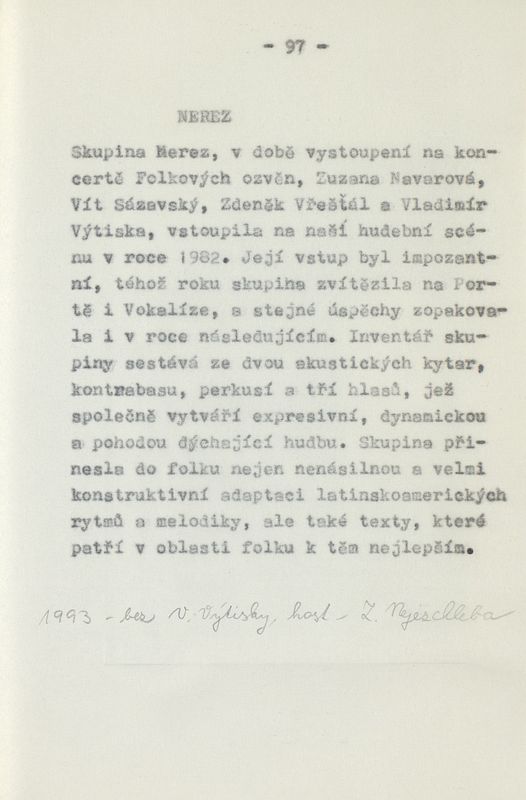 Vystoupení skupiny Nerez, první po roční přestávce, však dalo zapomenout na starosti s uspořádáním koncertu spojené. Dokonalý zvuk skupiny, nádherné a čisté vokály, sametový hebký alt Zuzany Navarové, kterému odpovídal jako nůž ostrý hlas Víta Sázavského, to v zútulnilo naplněný sál Sokolovny.