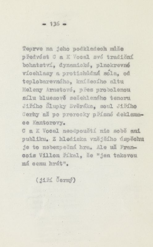 Vyvrcholením nejen posledního koncertu, ale Folkových ozvěn vůbec, se stalo závěrečné vystoupení I. ročníku, které obstarala skupina C a K Vocal. I když částečně poznamenané spěchem, který provázel celé odpoledne, náročnost, zaujetí a názor se jako červená nit táhly produkcí tohoto mimořádného sdružení. Silněji a přesvědčivěji než celá skupina za doprovodu nahrané hudby působila tentokrát živá sóla jednotlivých členů C a K Vocalu a závěrečné podání rockových evergreenů a capella.