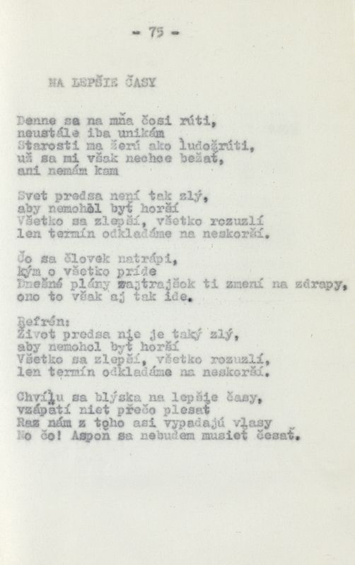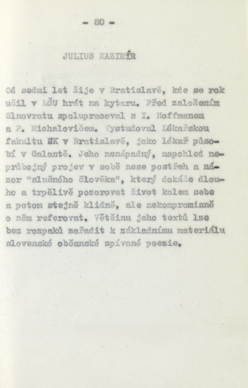 Výborné, často tragikomické texty a jednoduchý doprovod kytary, to jsou písničky Julia Kazimíra. Již po zahrání několika z nich se v sále vytvořila vzájemnost, kterou výstižně pojmenoval Kazimír slovy: „Najradšej by som zatleskal já vám.“